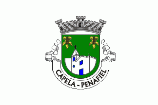 Shield Vert, a chapel Argent with port and windows Azure, in chief two corn cobs Or ordered per fess. Mural crown Argent with three visible towers (village rank) and white scroll with inscription in black capitals "CAPELA - PENAFIEL".