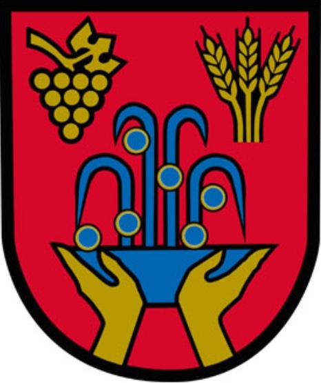 In a red shield, a blue bowl held by two golden hands, from which rises a blue fountain adorned with blue pearls framed in gold; the fountain is surmounted by a golden bunch of grapes and three golden ears of wheat.