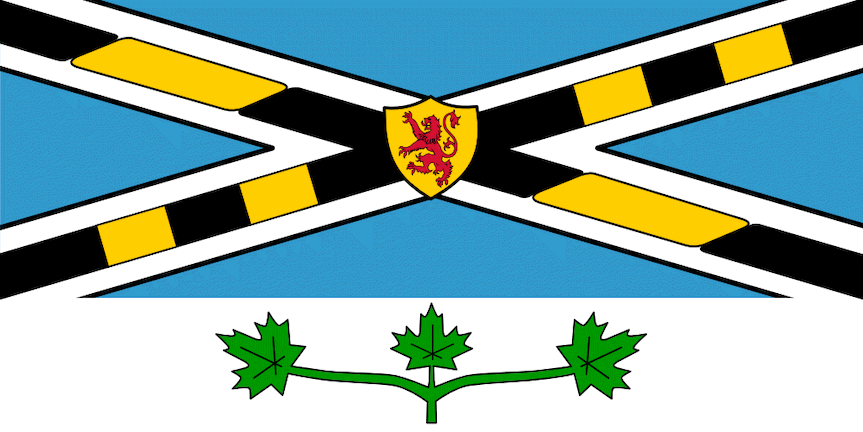 The blue and white satire with the smaller shield bearing the lion is representative of Scotland, from whence the early settlers came. The cable twist of gold and black symbolizes the first submarine cable in America, laid from Cape Tormentine, New Brunswick to Carleton Point in 1851. The opposite diagonal band represents the arrival of the railway to Borden in 1916.Source: Borden-Carleton website.