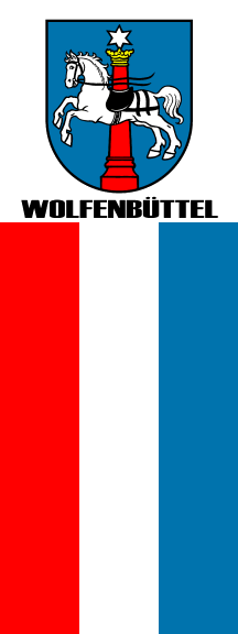It is a red-white-blue vertical tricolour. The coat of arms is in a white banner head, under the shield is a black inscription "WOLFENBÜTTEL"