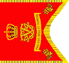 The cloth was red with golden fringes on three edges. In canton was the Danebrog, a red square parted by a white cross patty.