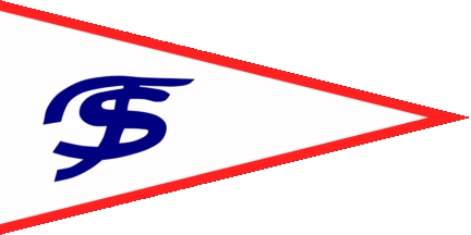 The pennant is white fimbriated red. Shifted to hoist are dark blue stylised intertwined initails "TS". Toreby is a little harbour located north of the tunnel between the islands of Lolland and Falster.