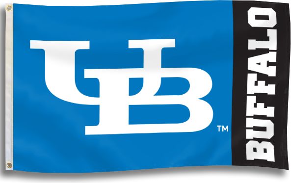A photo of the flag is available at www.smbs.buffalo.edu/obgyn/images/studentpix/2004_class.jpg, which clearly shows it as a blue flag with the seal in white, and UNIVERSITY AT arched above it, and BUFFALO written below it. The seal can be also found at www.buffalo.edu/toolbox/vi_introduction.html: