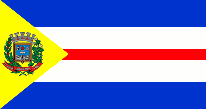 Horizontally banded 1-2-1 blue-white-blue, with a narrow red central stripe, and a triangular field extending from the hoist bearing the municipal arms.