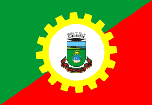 The flag of Canoas is divided green over red in an ascending diagonal, over the center a large yellow cog wheel with the municipal arms in the center on a white field.