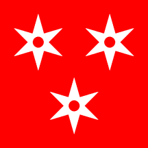 Gules, a Tower Argent roofed issuant from Coupeaux Sable between two Mullets Or pierced.
