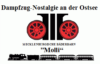 It is a white flag. At the top is a black inscription: "Dampfzug-Nostalgie an der Ostsee" (steam engine nostalgia at the Baltic Sea). In the centre are black objects probably symbolizing a rail. They are flanked by two red and black wheels of a tank engine. Below are centred black inscriptions in capitals "MECKLENBURGISCHE BÄDERBAHN"(1st line) and "MOLLI"(2nd line, bigger between inverted commas). At the bottom edge is a tank engine with a truck and three coaches, all in black.