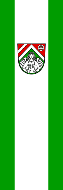 It is a green-white-green vertical tricolour, divided 1:4:1 with coat of arms shifted to the top within the white stripe.