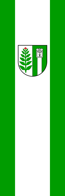 It is a green-white-green vertical tricolour, divided 1:4:1 with coat of arms shifted to the top within the white stripe.