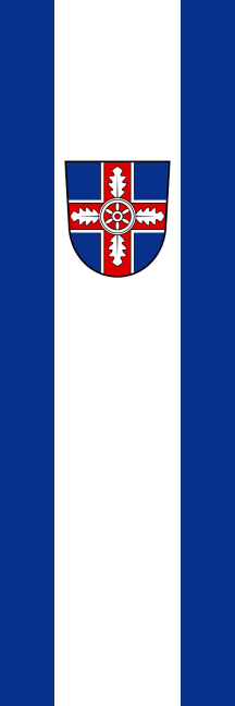 It is a blue-white-blue vertical tricolour, divided 1:2:1 with coat of arms shifted to the top within the white stripe.