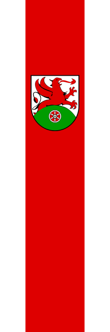 It is a white-red-white vertical tricolour, divided 1:4:1 with coat of arms shifted to the top within the red stripe.