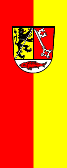 Red-yellow stripes, flag and coat-of-arms approved 7 March 1974. The lion in the coat-of-armd stands for the Bishopric of Bamberg, the key comes from the former county Ebermannstadt, and the fish is taken from the city of Forchheim.