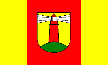 In a golden (= yellow) shield stands a red lighthouse upon a green hill having a silver (= white) fire. Its an image of the local lighthouse.
