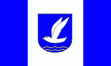 In a blue shield is a silver (= white) flying seagull above two wavy barrulets. Seagull and waves are alluding to the location on the shores of the Baltic Sea.