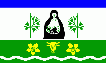 Shield Argent, a narrow chief Azure and a base Vert, issuant from base a nun, dressed in a habit Sable and garment Argent, holding a book Sable by her hands and flanked by two canes Vert, base Vert, over a throughout barrulet wavy Argent a bull's head caboshed Or, flanked by two kingcup blossoms Or.