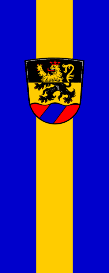 The arms were adopted on 24 February 1984 and show: Per fess Sable and Or a lion rampant counterchanged crowned tongued and armed Gules on a base wavy Gules a bend sinister Azure. The flag has been adopted probably at the same time; it has the colours blue-yellow-blue and shall bear the arms. Source: Wanka 1989 [wnk89].