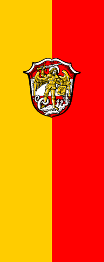 The arms were adopted on 5 Oct 1953 and show (blazon): Gules a bar Argent; overall, standing on a dragon Argent, St. Michael winged and armoured Or, in his right brandishing a sword Argent over his head and holding in his left a shield with the inscription "Quis ut Deus" ("Who is like God?", the meaning of "Michael". The flag was adopted at the same time; it has the colours yellow-red.