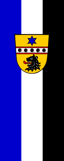 The arms was adopted on 13 January 1983 and show (blazon): Or between a mullet of six points Azure and a lion's head Sable langued Gules a fess Argent fimbriated Gules charged with five pellets. The flag was probably adopted at the same time; it has the colours blue-white-black.