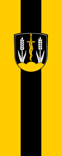 The arms was adopted on 16 August 1985 and show (blazon): Sable between two wheat ears Argent issuant from a triple mount Or a flaming sword point downwards of the same. The flag was probably adopted at the same time; it has the colours yellow-black-yellow and must bear the arms.