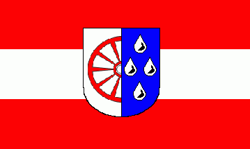 The shield is divided per pale. The dexter side shows a half red wheel with 5 spokes in a silver (= white) field. The sinister side shows four silver (=white) drops ordered 1:2:1 in a blue field.
