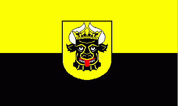 The ratio is 3:5. It is a yellow over black horizontal bicolour. The coat of arms is in the centre of the flag.