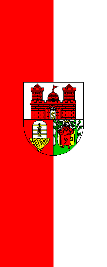 Schönebeck has 40,000 inhabitants, is the seat of Schönebeck county, and a neighbouring city of Magdeburg. The flag, used as a banner, is red-white with the arms. Source: Günther 1996b.