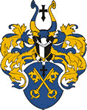 In a blue shield are two golden crossed keys and a black cross above the keys. The whole is topped by a helmet with blue and yellow scarves and another black cross in the crest, which is placed between two horns quarterly charged blue and golden.