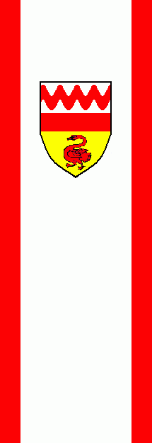 It is a red - white - red triband with ratio 1:5:1. The coat of arms is shifted to the top.