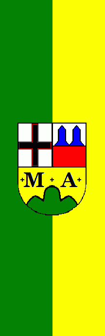 It is a green - yellow vertical bicolour. The coat of arms is in the centre of the banner.