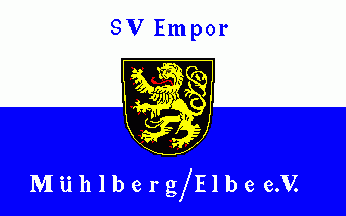 It is a 6-stripes flag divided by alternating yellow and blue stripes starting with a yellow one. The flag has a black canton in which a yellowish horn is superimposing a red mill wheel placed on a white background. This image is connecting the horn as a symbol of German mail with the wheel taken from the local coat of arms.