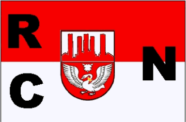 The white flag is horizontally divided by two narrow red stripes. In the centre between the stripes is the red eagle of the electorate of Brandenburg. The white canton has a black inscription of dotted capitals "N.R.C.". It is separated by black lines.