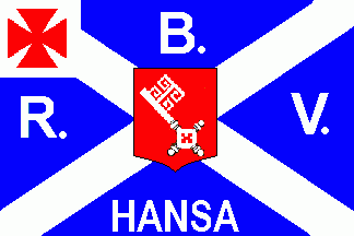 The flag was white parted by a red saltire. On centre was a white shield with red edges and charged with a red key of Bremen superimposed by a red oar in bend sinister, black inscriptions "O" (upper hoist), "R" (upper flat), "V" (lower hoist) and "B" (lower fly). It was a predecessor of Bremer RC Hansa and had the same flag with different letters.