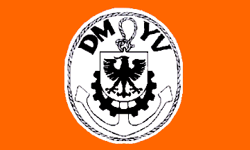 A black bordered white anchor is superimposed by a black gear, which is superimposed by a white shield containing a tongued totally black eagle facing the hoist. At ovals top edge are black capital letters ?DMYV?. The whole ensemble is surrounded by a white rope.