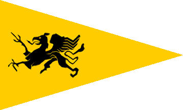 It is a white pennant with a shield shifted to the hoist. The shield is divided per bend sinister into red with a yellow scallop upon the dexter chief and plain yellow cotized red and yellow.