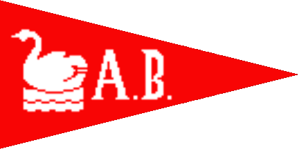 The pennant is red, at hoist is a white swan swimming to hoist over white waves, at fly are white initials "A.B.".