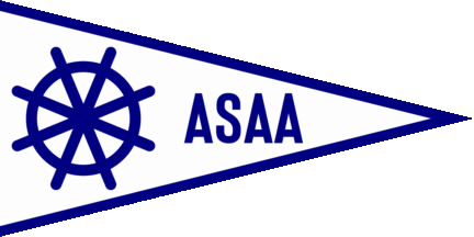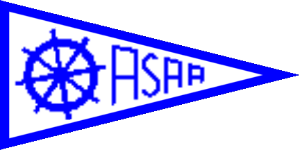 The pennant is white with blue edges. At hoist is a blue stearing wheel, at fly a blue inscription Asaa, either tapering alongside the edges (see left image above) orthe usual horizontal script (see right image above). Asaa is located North of the Limfjord on the eastern shore of the Vendsyssel Region.