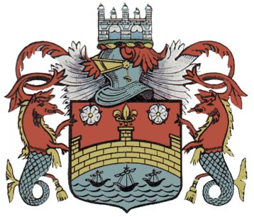 The Borough of Cambridge, recipient of many royal charters, was granted a coat of arms in 1575. The elements used emphasised the importance of river born trade to the town, and the privileges granted by many kings over the centuries. (The rose and fleur de lis are royal badges). Not until 1951 was the borough granted the status of a city, and this was re-awarded in 1874 after local government reorganisation. The arms conferred on the town by the Clarenceux King of Arms, Robert Cooke, in 1575 were described as: "Gules, a bridge, in chief a flower de luce gold between two roses silver on a point wave three boats sable, and to the crest upon the healme on a wreath gold and gules on a mount vert a bridge silver mantled gules doubled silver, the Arms supported by two Neptune's horses the upper part gules the nether part proper finned gold."(An image of the arms can also been seen at the site.)