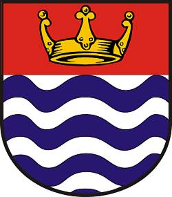 the three former boroughs. The shield has a border of wavy blue and white bars,