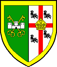 three embattled towers, superimposing a pair of golden keys in saltire. The