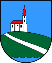 The coat of arms was blue over green with a depiction of the church of St. Stephen, white with a red roof, a white road running diagonally, and a wavy blue base.