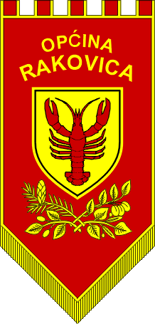 The flag is of gonfanon type, a vertically hoisted richly embroidered banner, rectangular with triangular ending, bordered in yellow and with a yellow fringe along the lower edges, also with five yellow bordered red rectangular sleeves for the crossbar along the upper hoist. The proportions are, rather approximately, 1:2. In the middle there is the coat of arms bordered yellow, above it there is arched inscription in two rows "OPĆINA RAKOVICA", and below there are four branches of different species typical for the region.