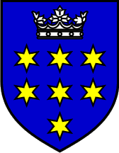 The coat of arms is "Azure seven mullets or, three and three and one, and in chief a Royal crown open argent".