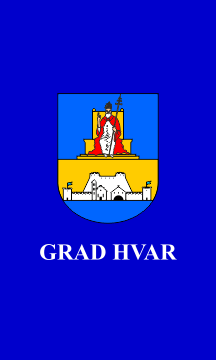 Per fess azure St. Stephen the Pope sitting on a throne or and or on a base azure the Town of Hvar argent: embatteled walls edged with two towers each topped with a blue flag opened in the middle between a church and the arsenal and behind it a castle on a rock.