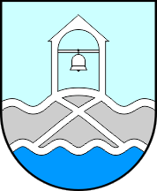 The coat of arms of Šestanovac is "Azure between a chapterhouse with a bell issuant from two wavy barrulets a saltire all argent on gray."