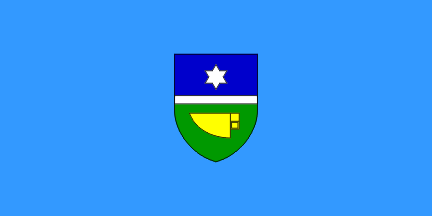 In the 1990s, a light blue flag was used with a different coat of arms, "Per fess with a bar argent chief azure a mullet argent and base vert a ploughshare or".