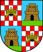 In the coat of arms are set diagonally two chequy fields with contour lines starting with a red field, each including a Tomislav Crown - the crown of King Tomislav, coloured golden yellow.