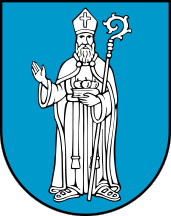 The coat of arms is described in Article 6 of the Decision as "blue, a silver representation of St. Nicholas".