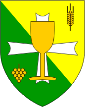 The coat of arms of Brckovljani is "Or a chalice also or on a pile inverted vert between a Maltese cross gules and a bunch of grapes azure slipped with two leaves vert.".