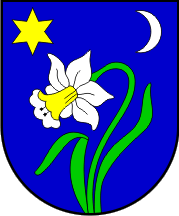 The coat of arms of Bedenica is "Azure a daffodil proper issuant from the base with two leaves vert and in chief dexter a mullet or and in chief sinister a crescent argent".