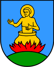The heraldic shield is a classical one. In the central part of it, on blue background is a couldron in which is St. Vitus coloured golden on red flames of fire. In the shield base is in a green hill.